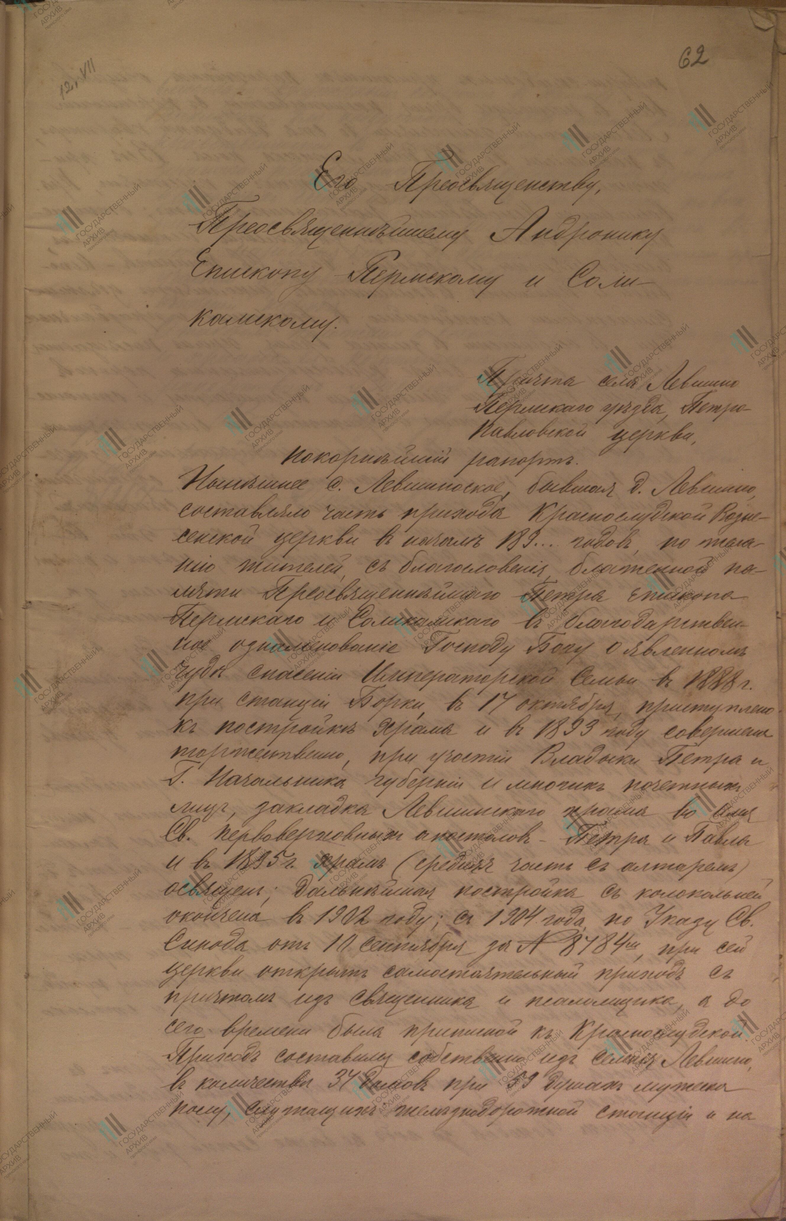 Реквизиты документа: Рапорт причта епископу Пермскому и Соликамскому Андронику о состоянии Левшинской Петропавловской церкви и прихода. 12.07.1916 // ГАПК. Ф. 664. Оп. 1. Д. 8. Л. 62-65