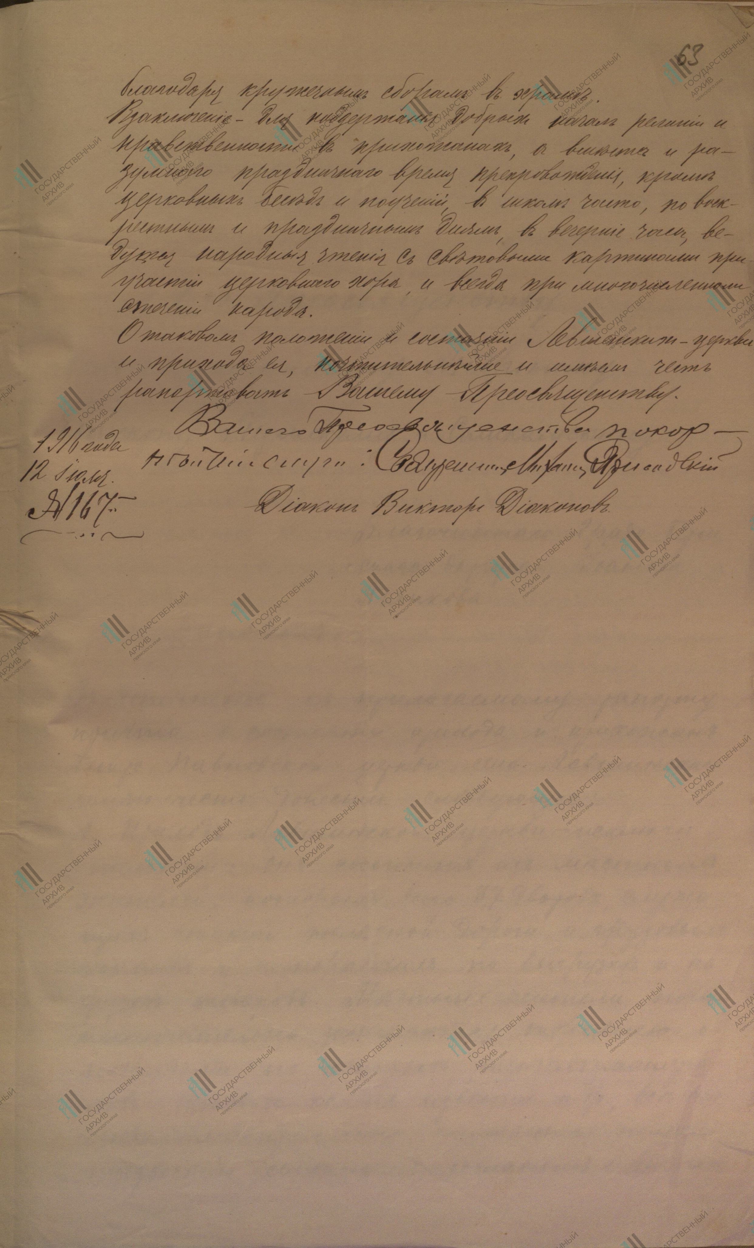 Реквизиты документа: Рапорт причта епископу Пермскому и Соликамскому Андронику о состоянии Левшинской Петропавловской церкви и прихода. 12.07.1916 // ГАПК. Ф. 664. Оп. 1. Д. 8. Л. 63