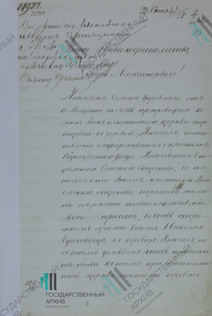 Перечень выявленных документов: Материалы (указы, прошения, рапорты) о строительстве новой деревянной Николаевской церкви с. Янычевского. 1858 г. // ГАПК. Ф. 39. Оп. 4. Д. 43. Л. 40-41.