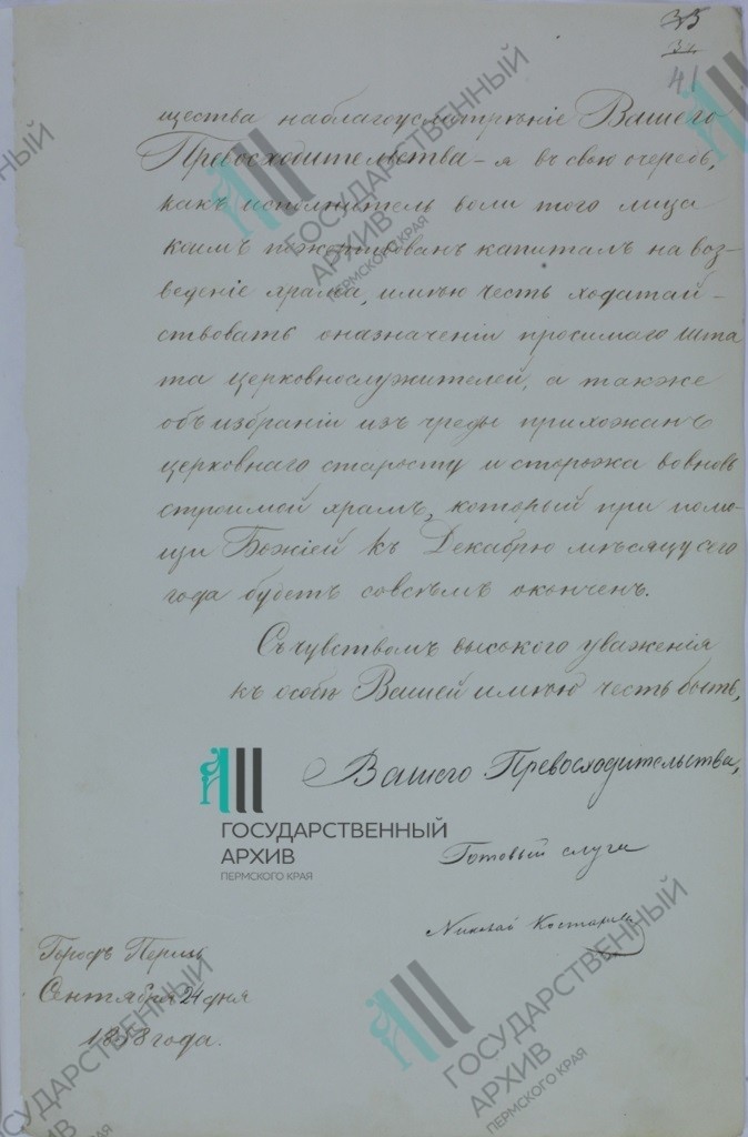 Реквизиты документа: Материалы (указы, прошения, рапорты) о строительстве новой деревянной Николаевской церкви с. Янычевского. 1858 г. // ГАПК. Ф. 39. Оп. 4. Д. 43. Л. 41.