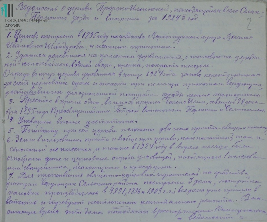 Реквизиты документа: Клировые ведомости Пророко-Ильинской церкви с. Сёла Пермского уезда за 1915, 1917, 1924 гг. // ГАПК. Ф. 195. Оп. 1. Д. 30. Л. 2