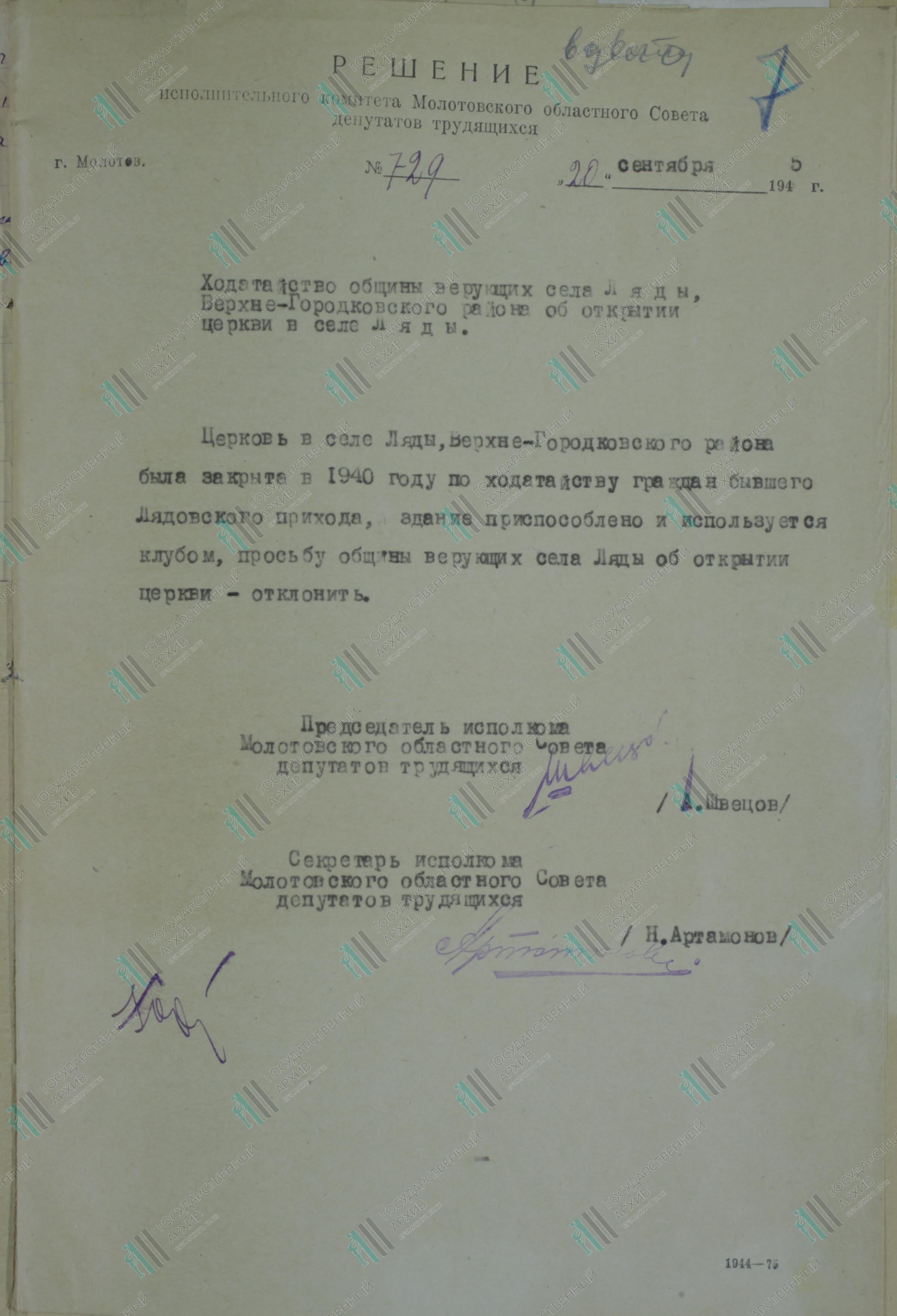 Реквизиты документа: Решение исполкома Молотовского областного совета депутатов трудящихся №729 от 20 сентября 1945 г. о ходатайстве общины верующих с. Ляды об открытии церкви в с. Ляды // ГАПК. Ф. р-1205. Оп. 1. Д. 172. Л. 7.