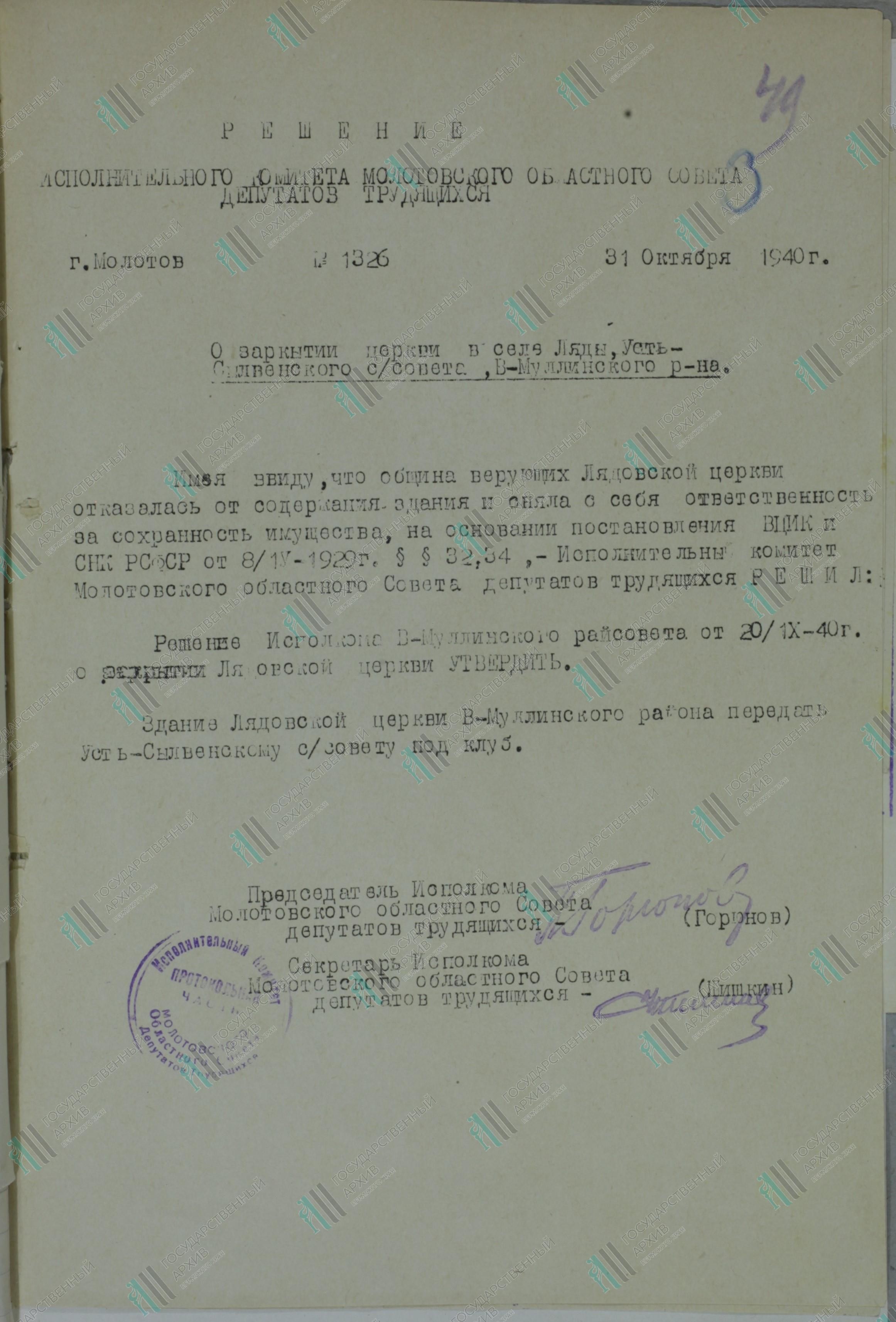 Реквизиты документа: Решение Исполкома Пермского областного совета депутатов трудящихся №1326 от 31 октября 1940 г. о закрытии церкви в селе Ляды. // ГАПК. Ф. р-1205. Оп. 1. Д. 191. Л. 49.