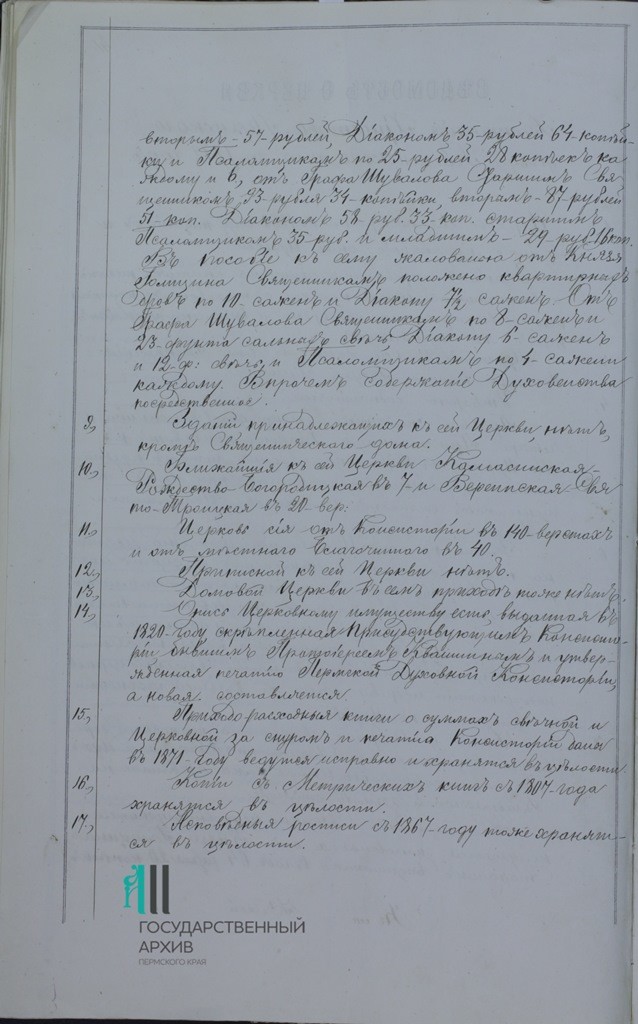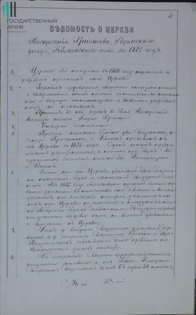 Реквизиты документа: Клировые ведомости Воскресенской церкви с.Калино Пермского уезда за 1872 г. // ГАПК. Ф.195. Оп.1. Д. 36. Л. 41.