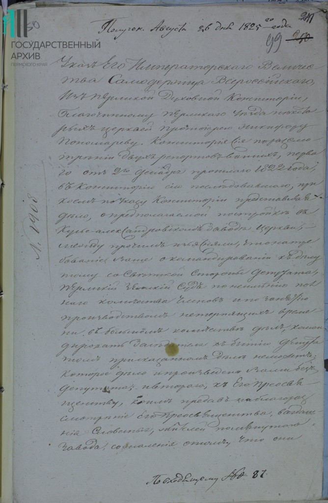 Реквизиты документа: Документы (указы из Пермской духовной консистории, отношения) о предполагаемой постройке церкви в Кусье-Александровском заводе 21.08.1825 - 11.09.1825 // ГАПК. Ф. 195. Оп. 1. Д. 93. Л. 99.