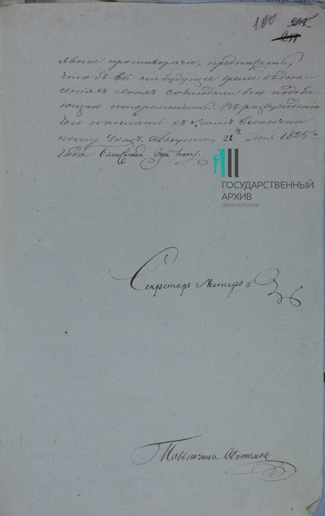 Реквизиты документа: Документы (указы из Пермской духовной консистории, отношения) о предполагаемой постройке церкви в Кусье-Александровском заводе 21.08.1825 - 11.09.1825 // ГАПК. Ф. 195. Оп. 1. Д. 93. Л. 100