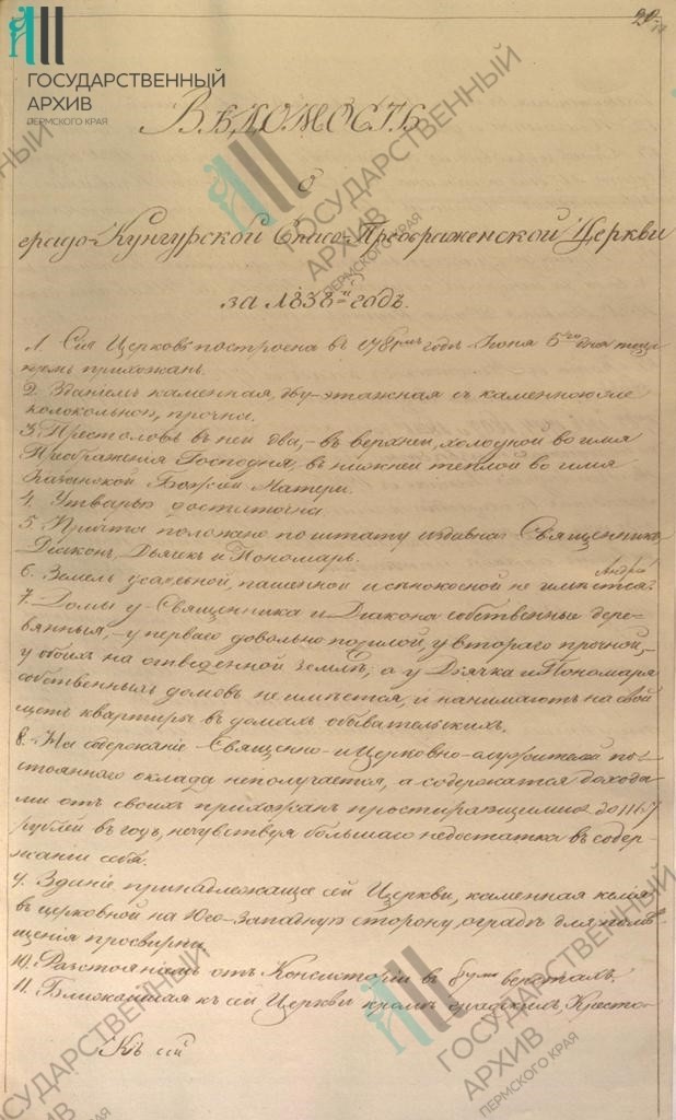 Перечень выявленных документов: Указ Кунгурского духовного правления священноцерковнослужителям Кунгурской Преображенской церкви о разрешении заменить деревянную крышу данной церкви на железную. 23.02.1811 г. // ГАПК. Ф. 636. Оп. 1. Д. 16. Л. 131-131 об.; Здание Спасо-Преображенской церкви в г. Кунгуре. 2011 г. Фотография // КГА. Ф. р-1001. Оп. 1. Д. 291.
