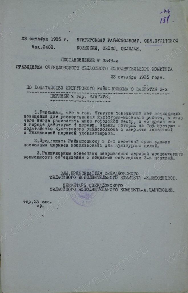 Реквизиты документа: Постановление №2549 Президиума Свердловского областного исполнительного комитета от 23 октября 1935 г. по ходатайству Кунгурского райисполкома о закрытии Успенской и Тихвинской церквей в г. Кунгуре. // ГАПК. Ф. р-1205. Оп. 1. Д. 68. Л. 151.