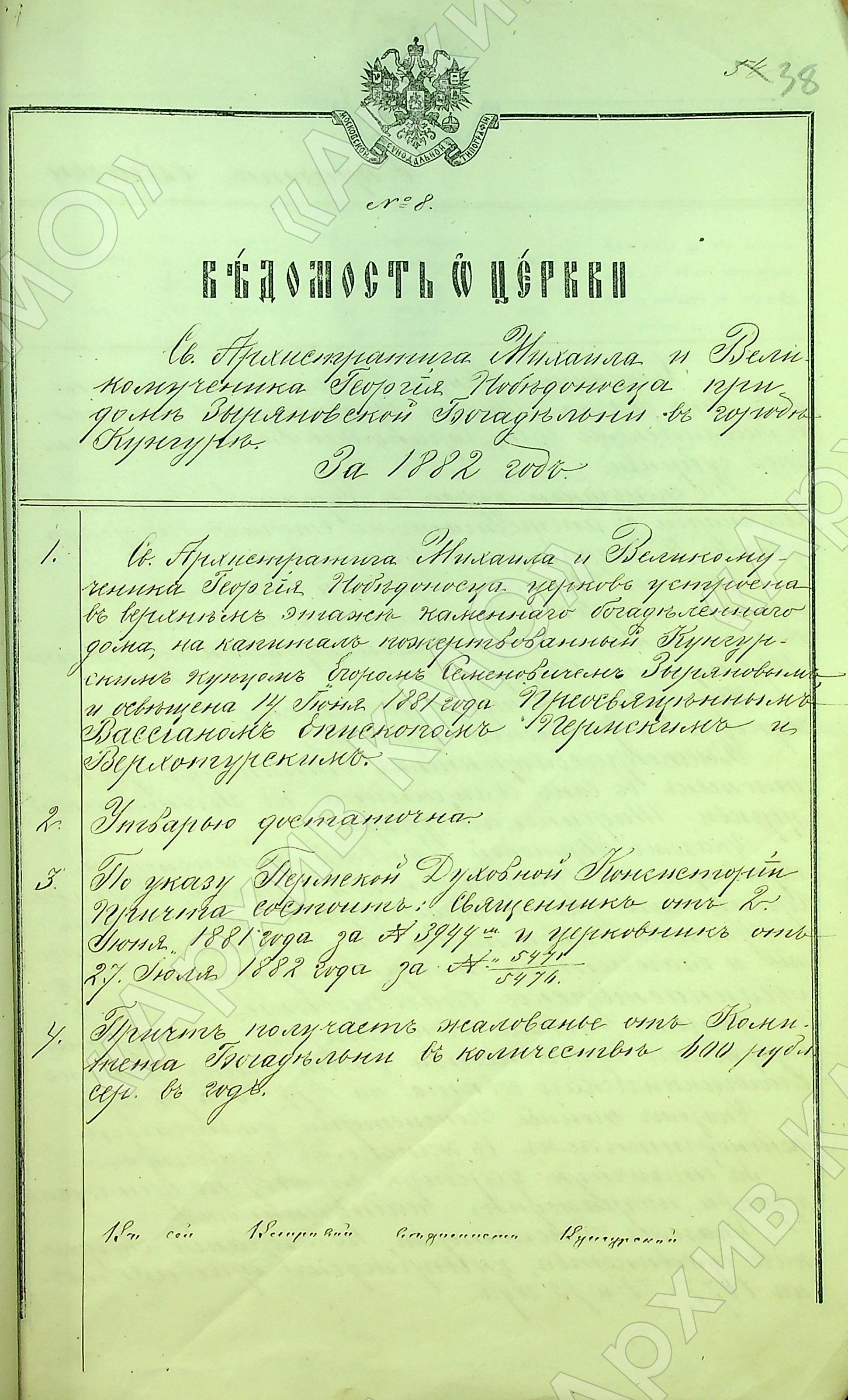Реквизиты документа: Клировая ведомость церкви Михаила и Георгия при Зыряновской богадельне. 1882 г. // КГА. Ф. 497. Оп. 1. Д. 5а. Л. 38.