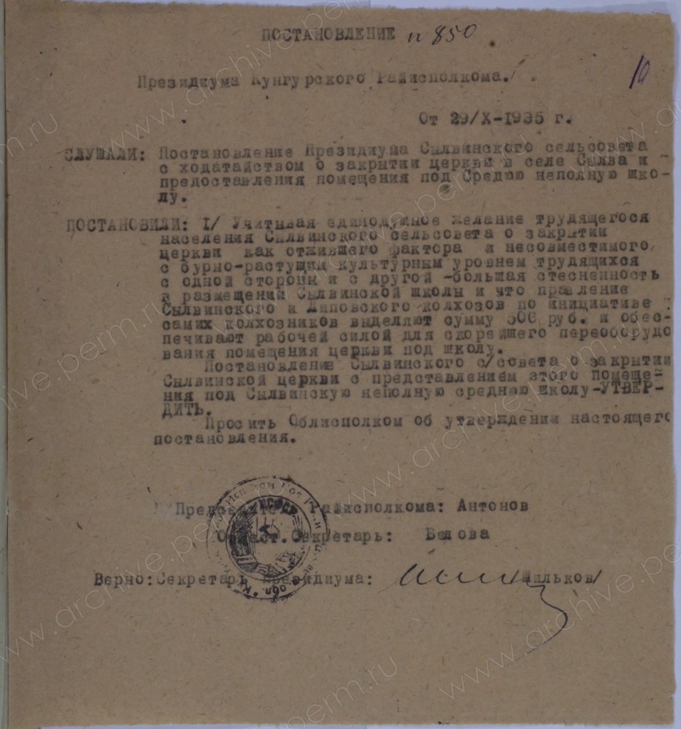 Реквизиты документа: Постановление №850 Президиума Кунгурского райисполкома от 29 октября 1935 г. о закрытии Сылвинской церкви // ГАПК. Ф. р-1205. Оп. 1. Д. 314. Л. 10.