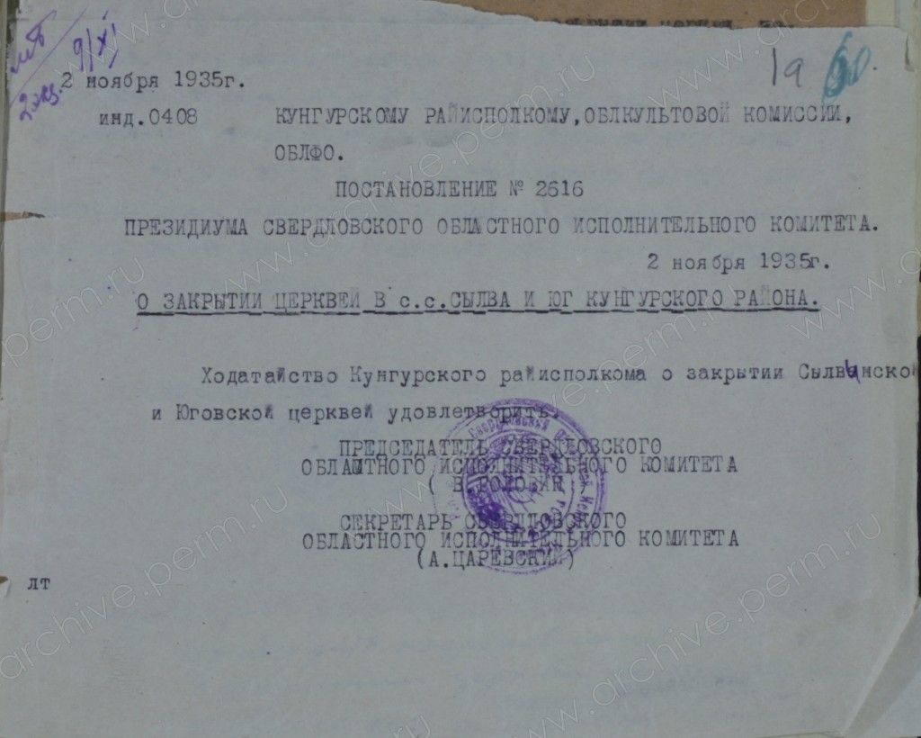 Реквизиты документа: Постановление №2616 Президиума Свердловского областного исполнительного комитета от 2 ноября 1935 г. о закрытии церквей в с.с. Сылва и Юг Кунгурского района // ГАПК. Ф. р-1205. Оп. 1. Д. 315. Л. 1а.