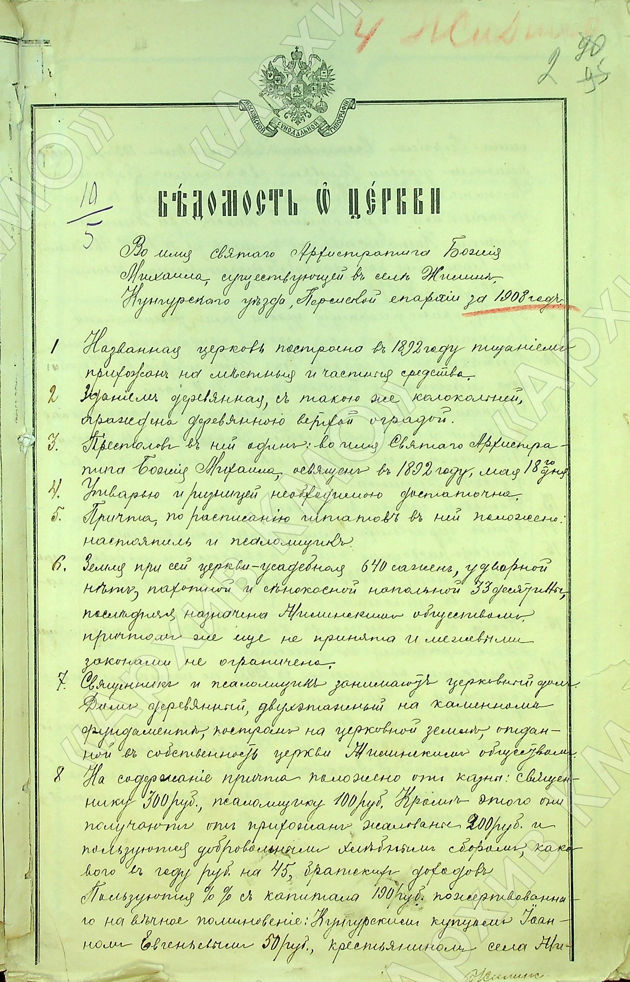 Реквизиты документа: Клировая ведомость Михаило-Архангельской церкви с. Жилинского за 1908 г. // КГА. Ф. 497. Оп. 1. Д. 8г. Л. 2