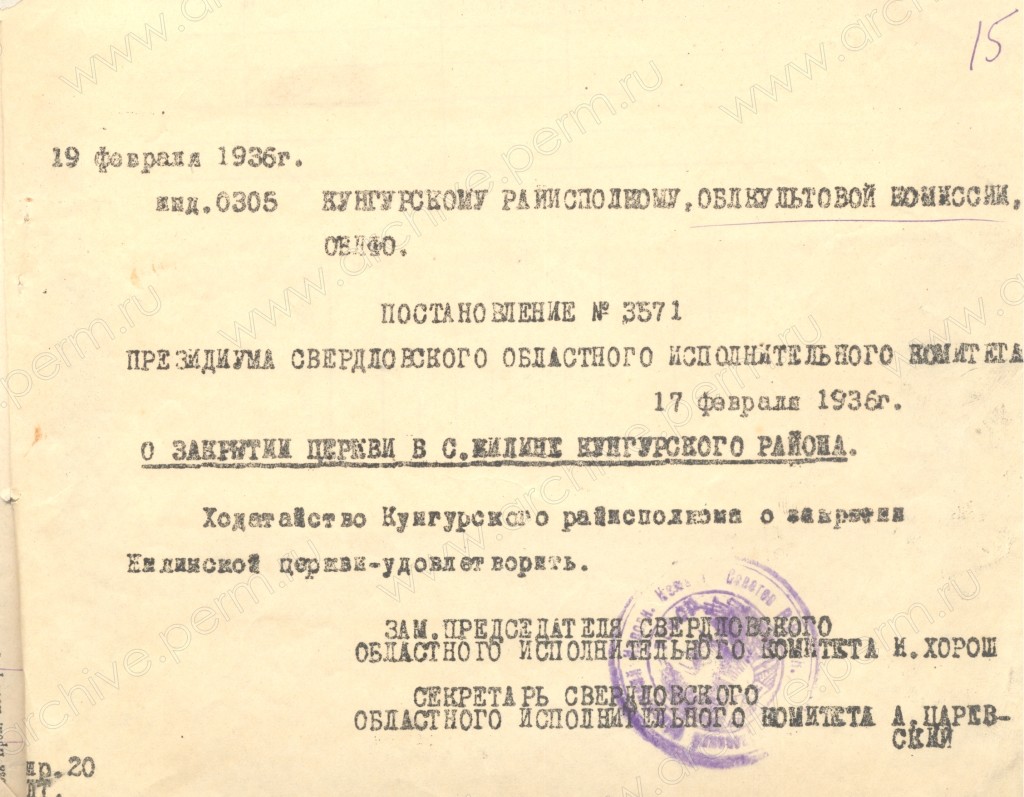 Реквизиты документа: Постановление №3571 Президиума Свердловского областного исполнительного комитета от 19 февраля 1936 г. о закрытии церкви в с. Жилино Кунгурского района // ГАПК. Ф. р-1205. Оп. 1. Д. 303. Л. 15.