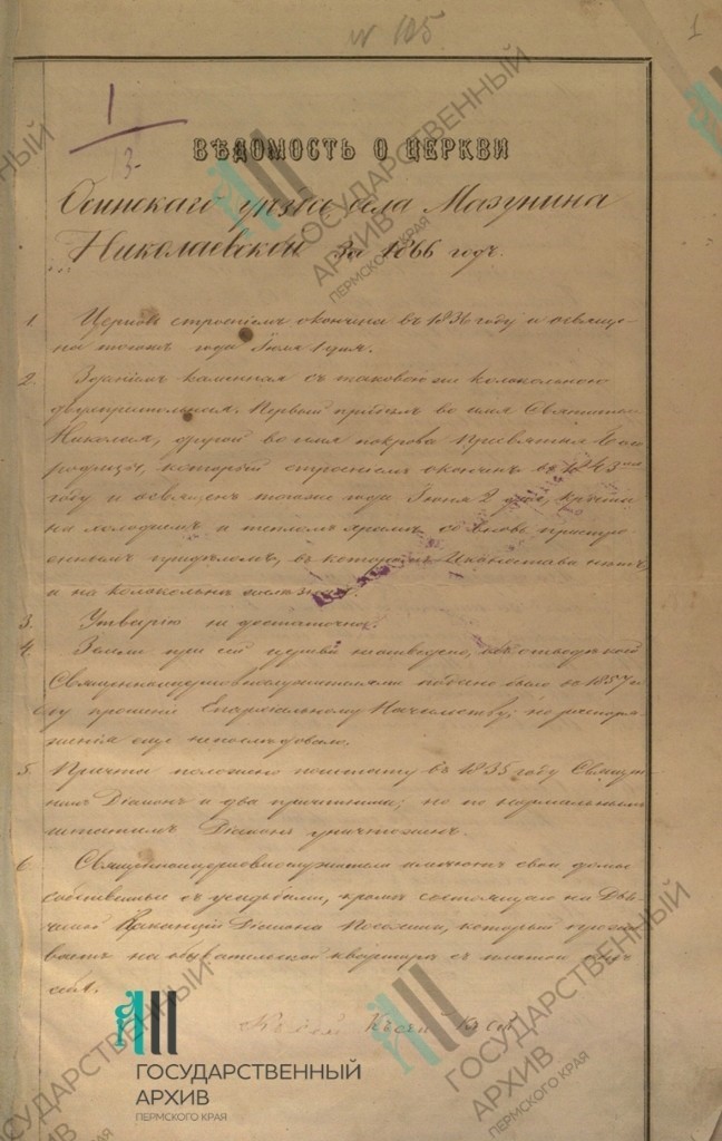 Реквизиты документа: Клировые ведомости Николаевской церкви с. Мазунинского за 1866г. // ГАПК. Ф. 390. Оп. 1. Д. 1. Л. 1.