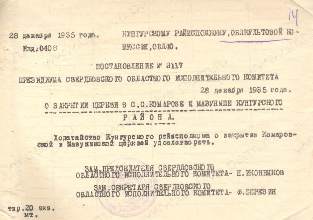 Реквизиты документа: Постановление №3117 Президиума Свердловского областного исполнительного комитета от 28 декабря 1935 г. о закрытии церквей в селах Комарово и Мазунино Кунгурского района // ГАПК. Ф. р-1205. Оп. 1. Д. 305. Л. 14.