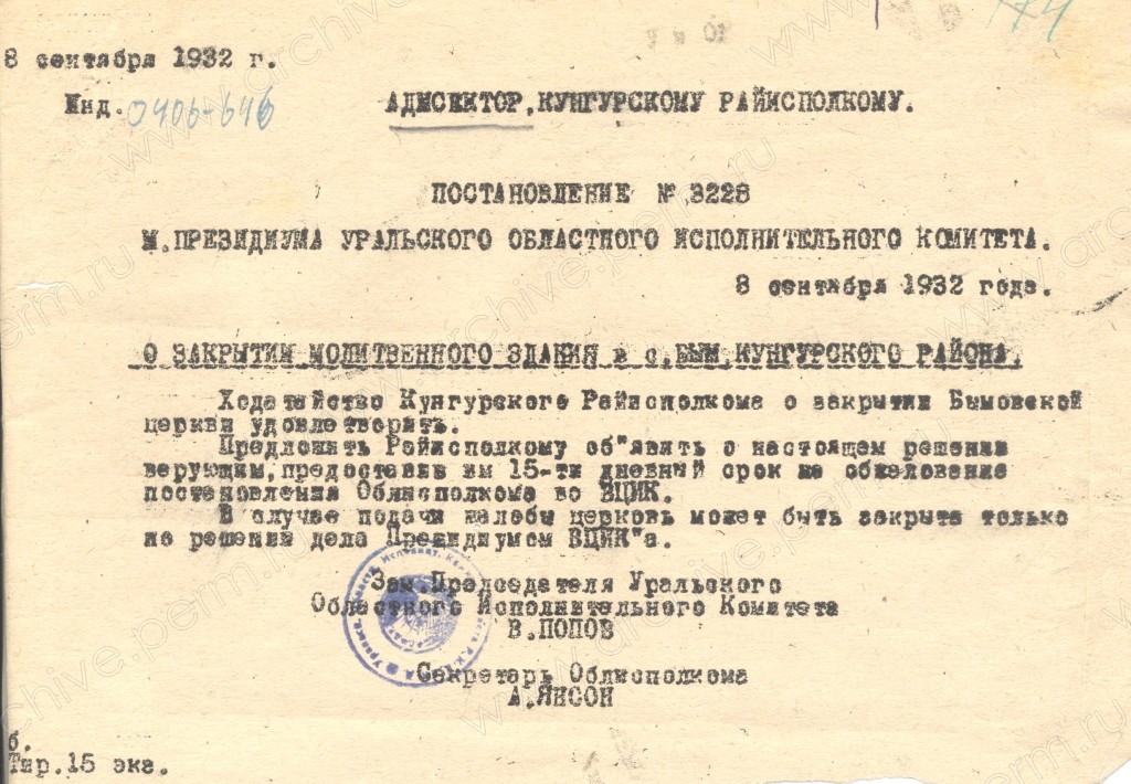 Реквизиты документа: Постановление №3228 Малого Президиума Уральского областного исполнительного комитета от 8 сентября 1936 г. о закрытии церкви в с. Бым Кунгурского района // ГАПК. Ф. р-1205. Оп. 1. Д. 291. Л. 1.