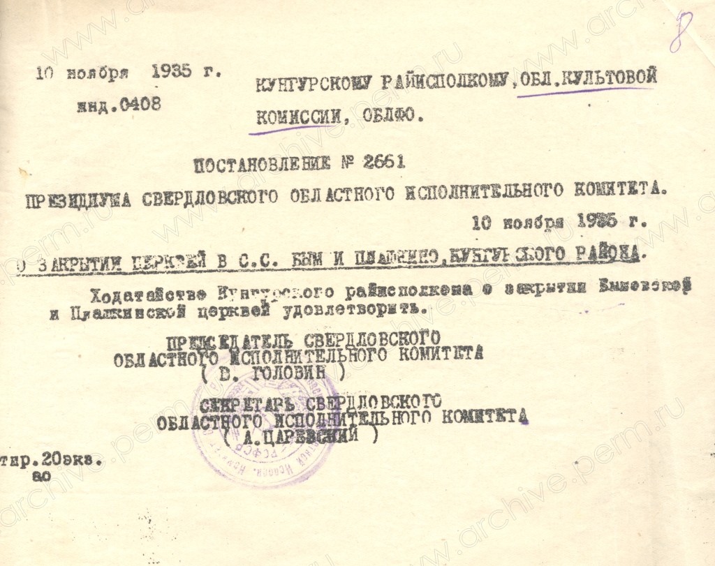 Реквизиты документа: Постановление №2661 Президиума Свердловского областного исполнительного комитета от 10 ноября 1935 г. о закрытии церквей в селах Бым и Плашкино Кунгурского района // ГАПК.Ф. р-1205. Оп. 1. Д. 312. Л. 8.