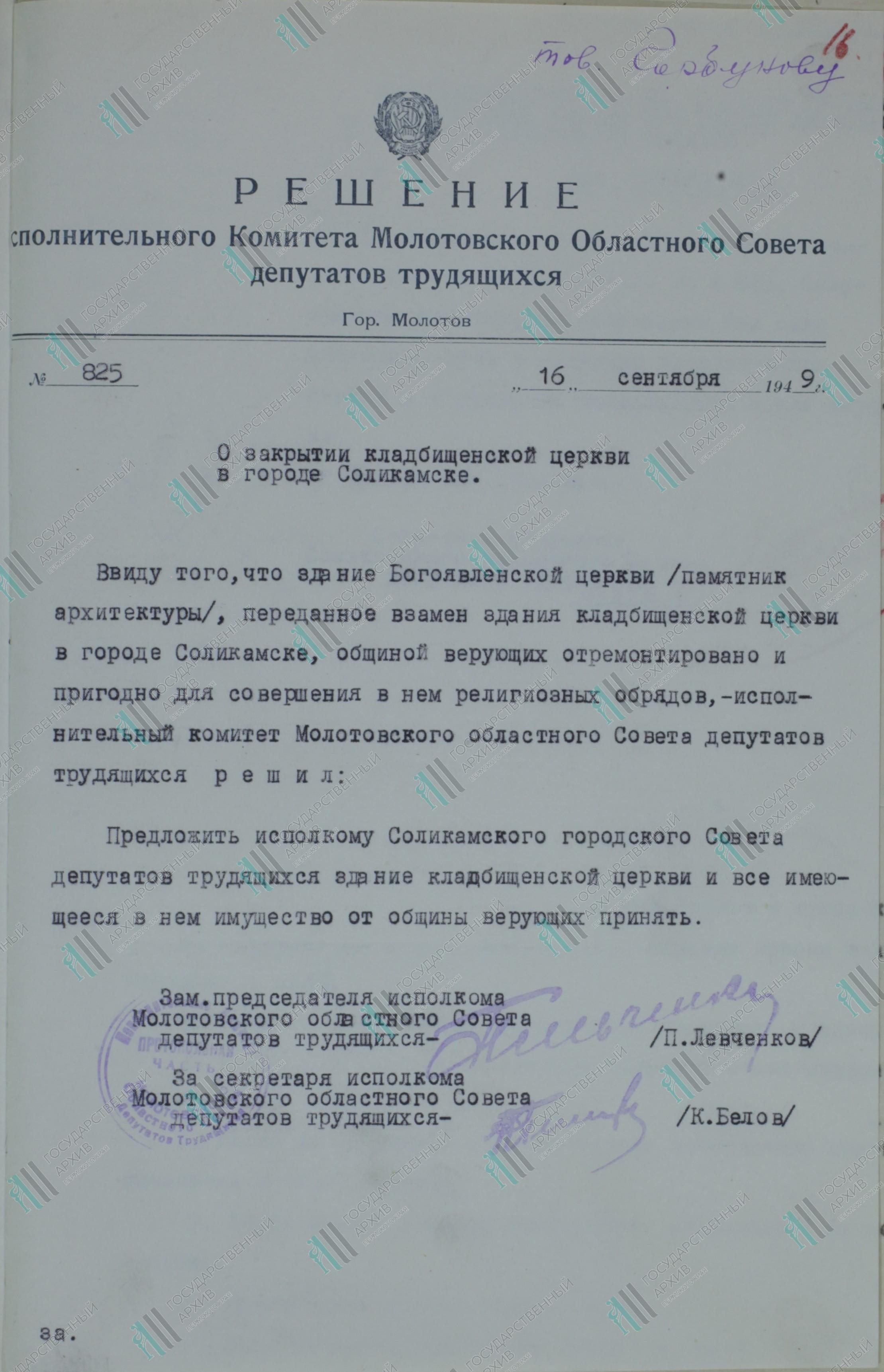 Реквизиты документа: Решение Молотовского облисполкома №825 от 16 сентября 1949 г. о закрытии кладбищенской церкви в г. Соликамске. // ГАПК. Ф. р-1205. Оп. 1. Д. 75. Л. 16.