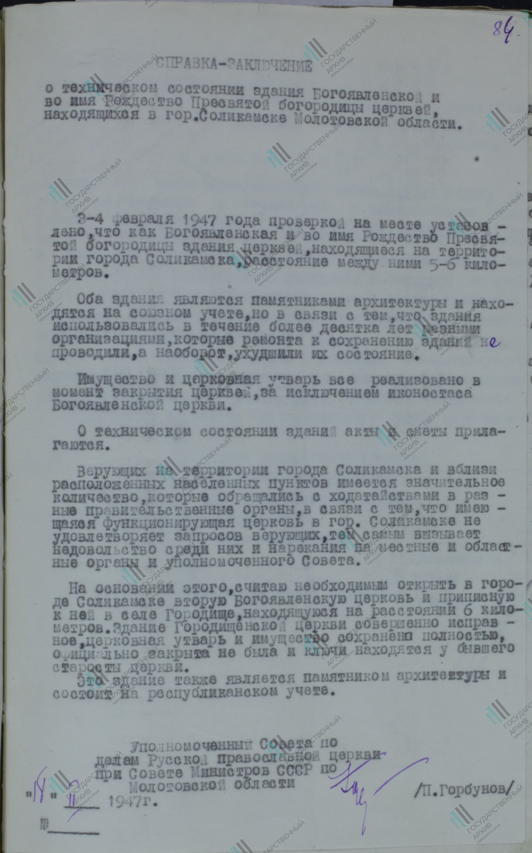 Реквизиты документа: Справка-заключение о техническом состоянии зданий Рождество-Богородицкой и Богоявленской церквей в г. Соликамске. 14 февраля 1947 г. // ГАПК. Ф. р-1205. Оп. 1. Д. 515. Л. 84