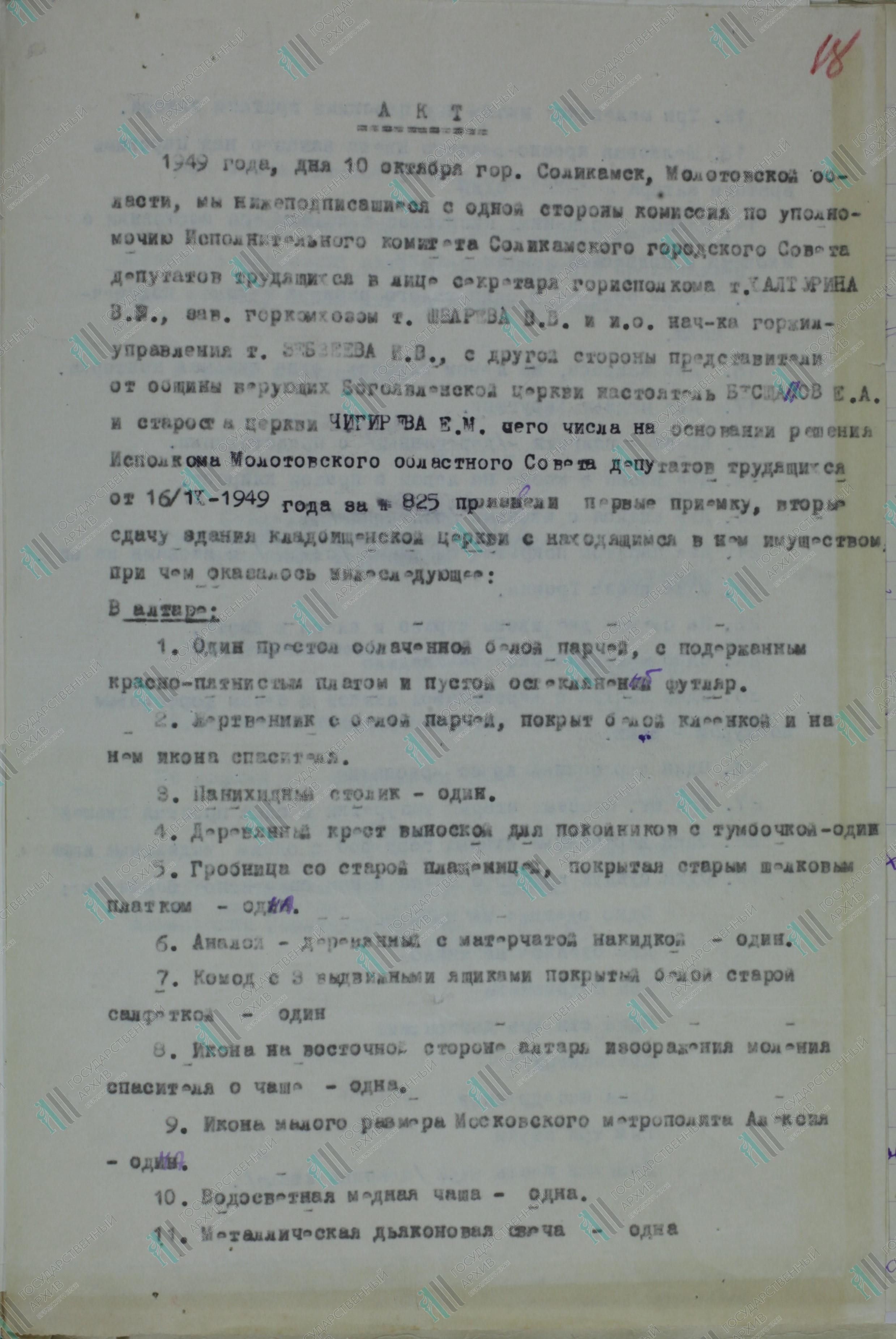 Реквизиты документа: Акт передачи имущества Богоявленской церкви. 10 октября 1949 г. // ГАПК. Ф. р-1205. Оп. 1. Д. 75. Л. 18