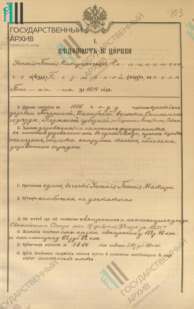 Реквизиты документа: Клировые ведомости Успенской церкви с. Белкинского за 1914 г. // ГАПК. Ф. 540. Оп. 1. Д. 4. Л. 103