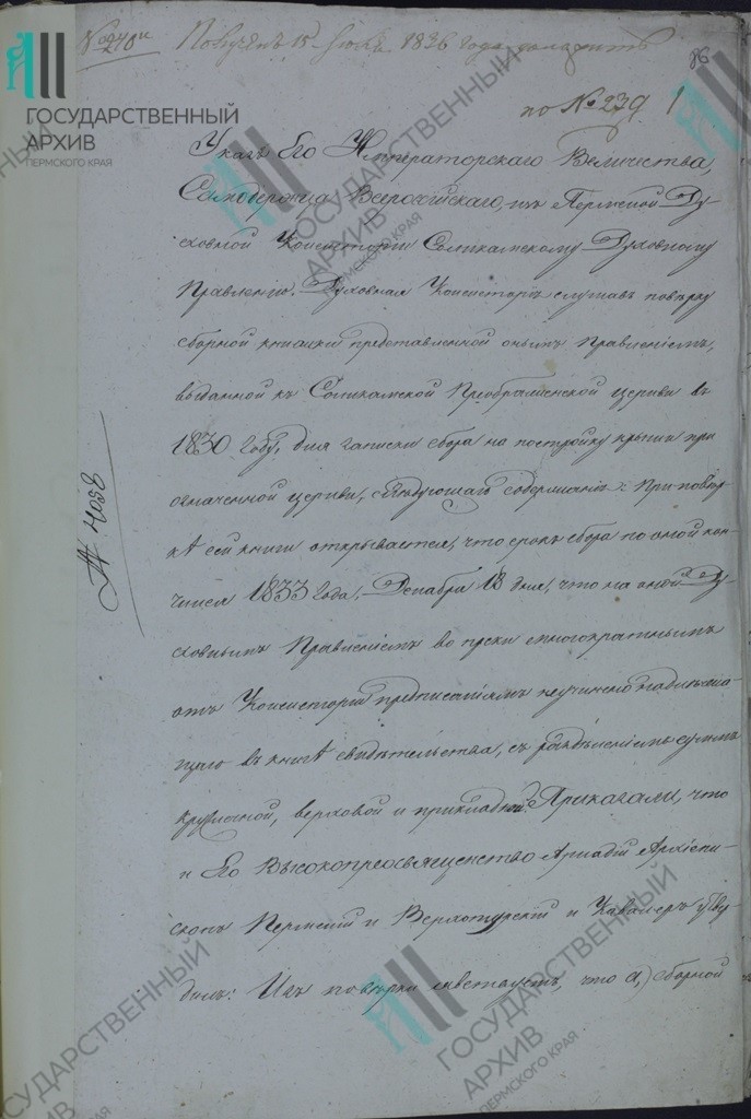 Реквизиты документа: Документы (указ из Пермской духовной консистории, рапорты,объяснения) о сборе средств на постройку крыши 02.07.1836 - 25.07.1836 г. // ГАПК. Ф. 99. Оп.1. Д. 15. Л. 86.