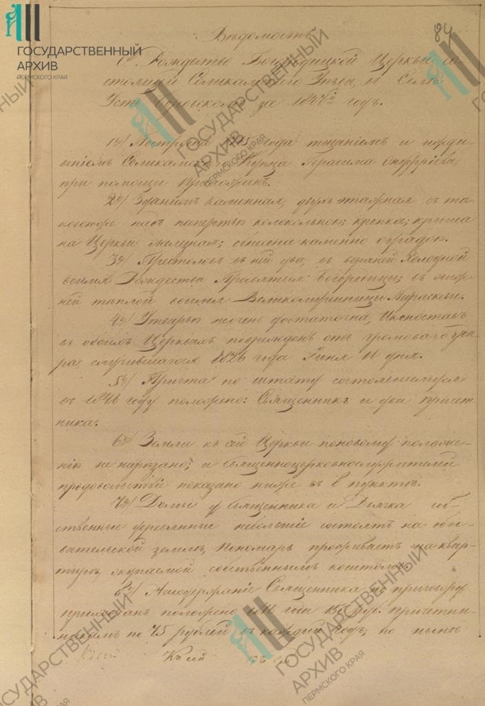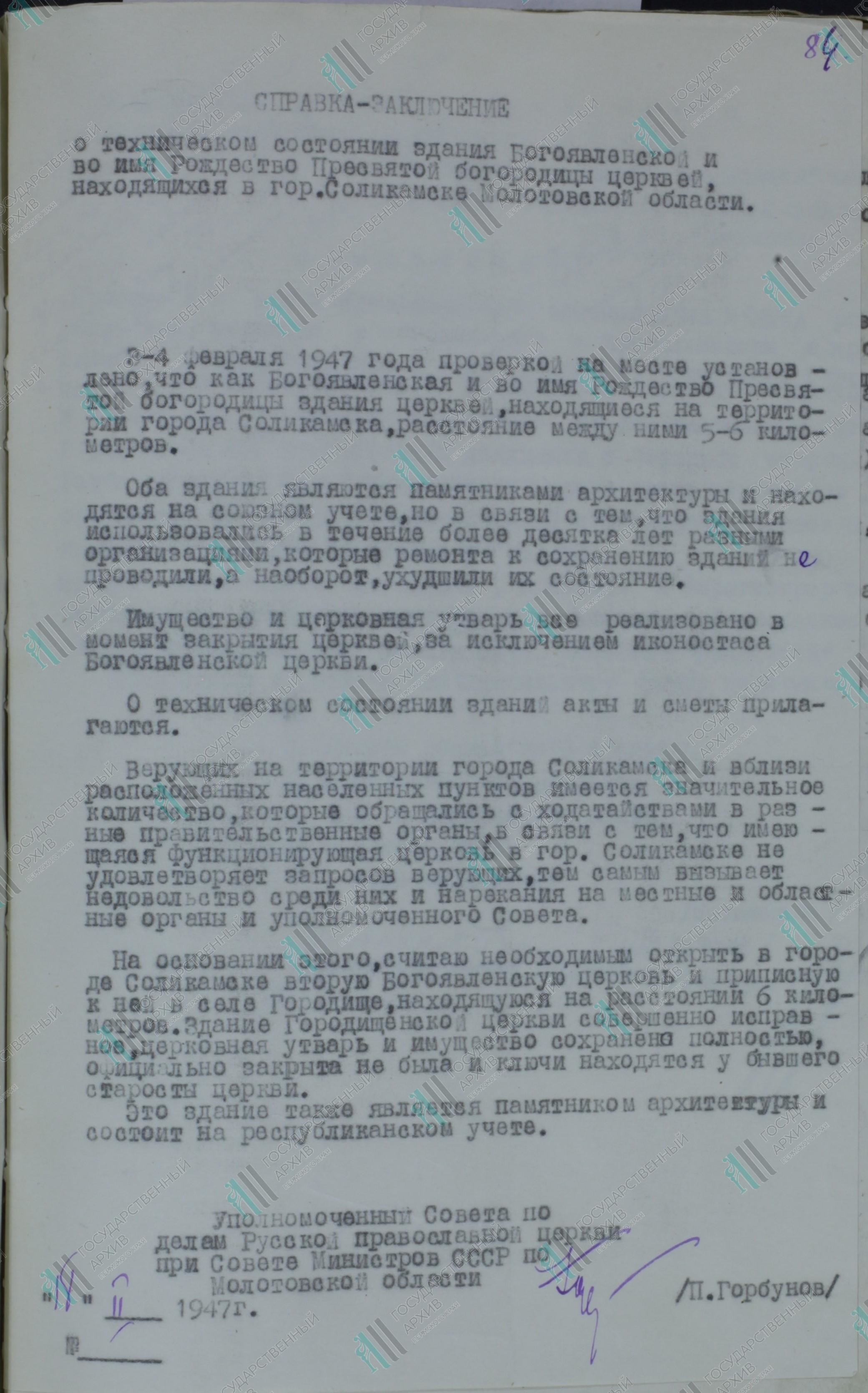 Реквизиты документа: Справка-заключение о техническом состоянии зданий Рождество-Богородицкой и Богоявленской церквей в г. Соликамске. 14 февраля 1947 г. // ГАПК. Ф. р-1205. Оп. 1. Д. 515. Л. 84