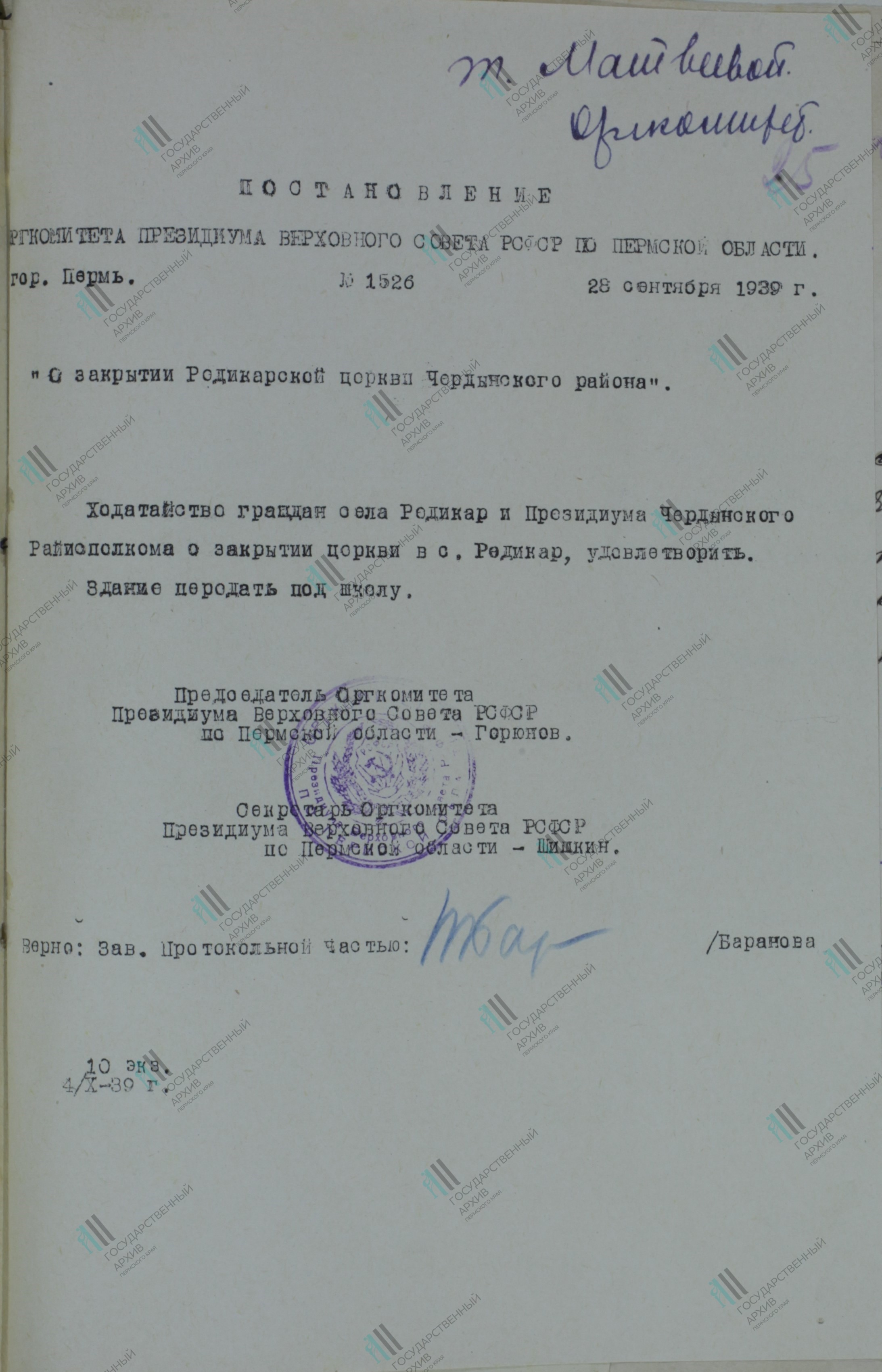 Реквизиты документа: Постановление Оргкомитета Президиума Верховного Совета РСФСР по Пермской области №1526 от 28.09.1939 г. о закрытии Николаевской церкви в с. Редикор Чердынского района // ГАПК. Ф. р-1205. Оп. 1. Д. 608. Л. 25