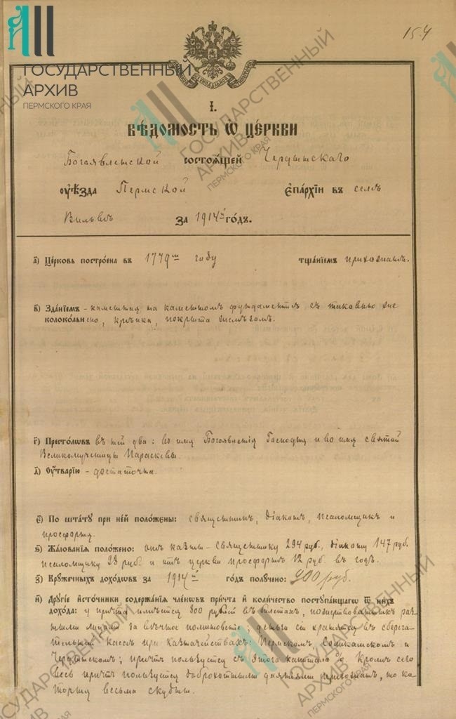 Реквизиты документа: Клировые ведомости Богоявленской церкви с. Вильва за 1914 г. // ГАПК. Ф. 258. Оп. 1. Д. 2. Л. 154.