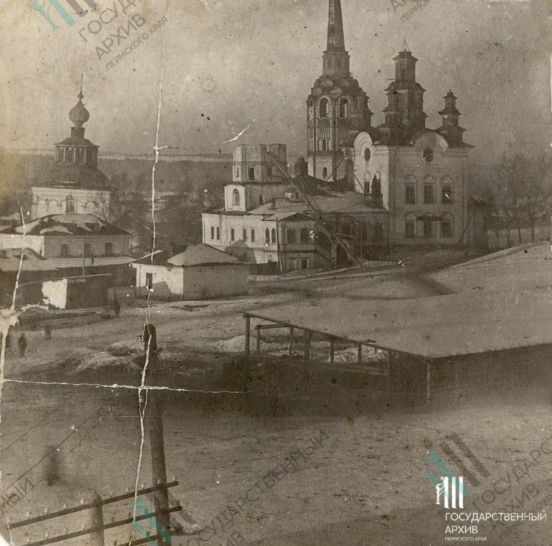 Перечень выявленных документов: Здания Крестовоздвиженского собора, Соборной колокольни и Воскресенской церкви в г. Соликамске. Начало XX в. Фотография // ГАПК. Ф. ф-60. Оп. 60п. Д. 618.