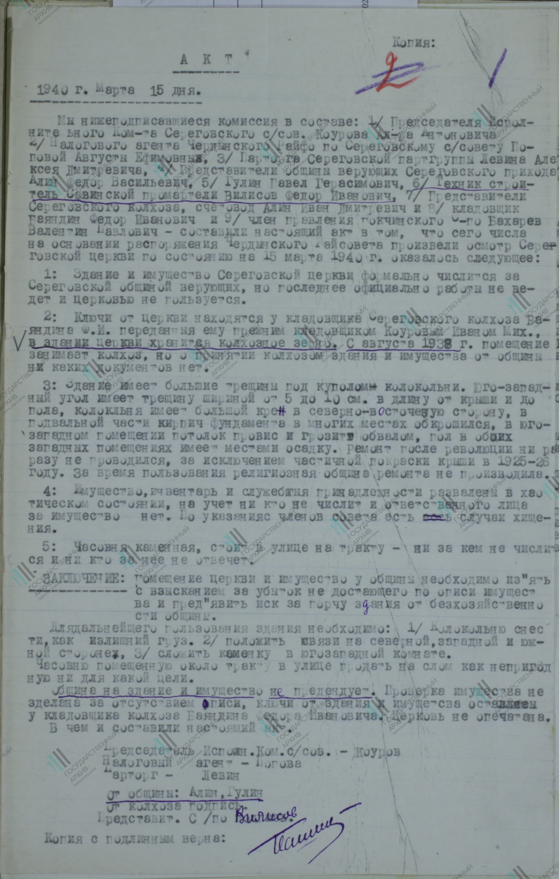 Реквизиты документа: Акт о техническом состоянии Георгиевской церкви 15.03.1940 // ГАПК. Ф. р-1205. Оп. 1. Д. 600. Л. 1