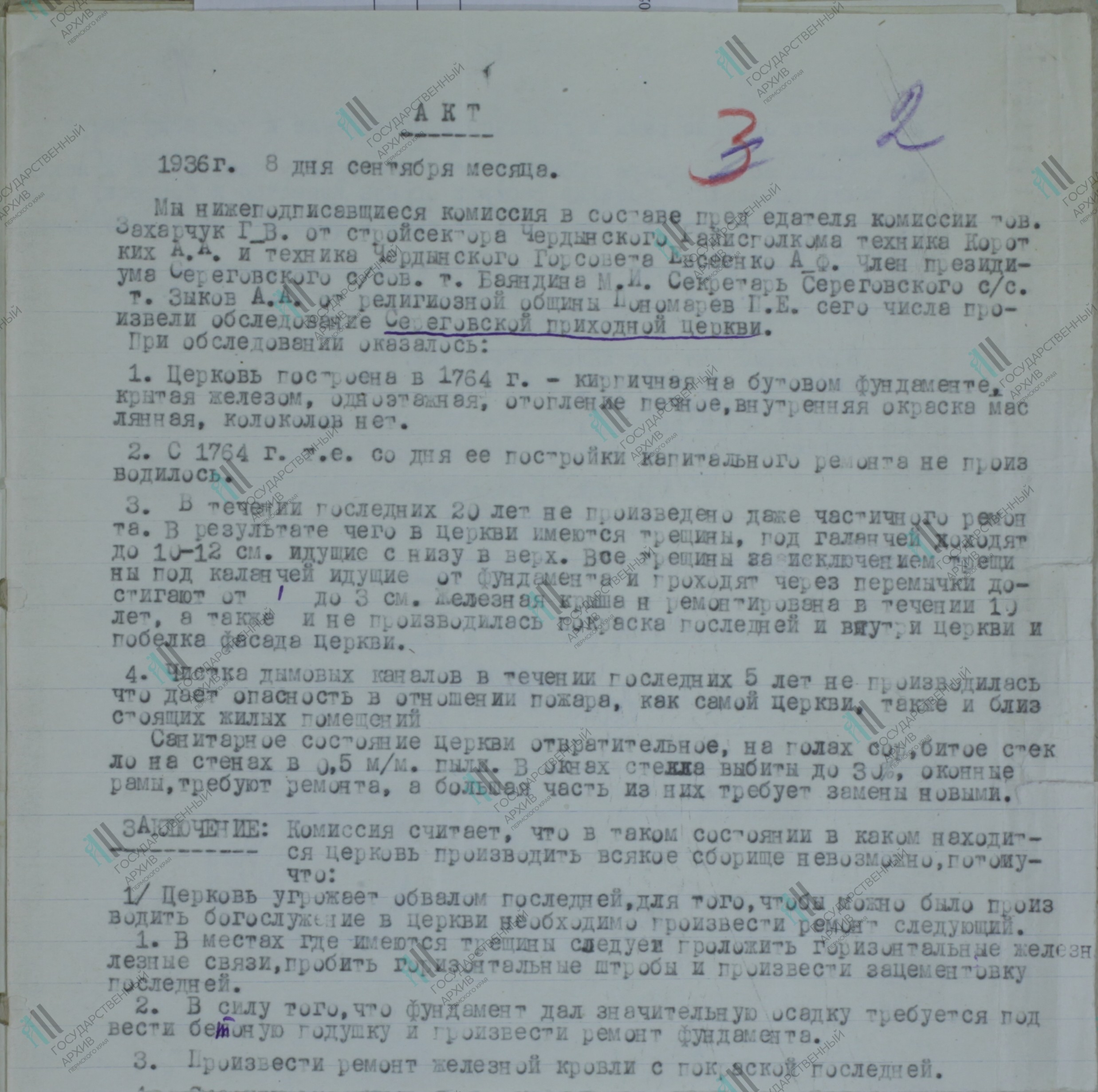 Реквизиты документа: Акт о техническом состоянии Георгиевской церкви 8 сентября 1936 г. // ГАПК. Ф. р-1205. Оп. 1. Д. 600. Л. 2