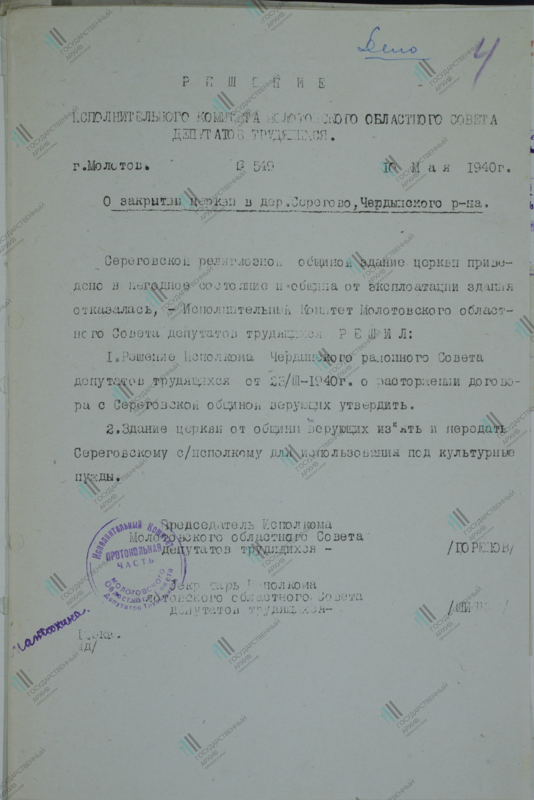 Реквизиты документа: Решение Исполкома Молотовского областного совета депутатов трудящихся о закрытии Георгиевской церкви. 10.05.1940 // ГАПК. Ф. р-1205. Оп. 1. Д. 600. Л. 4