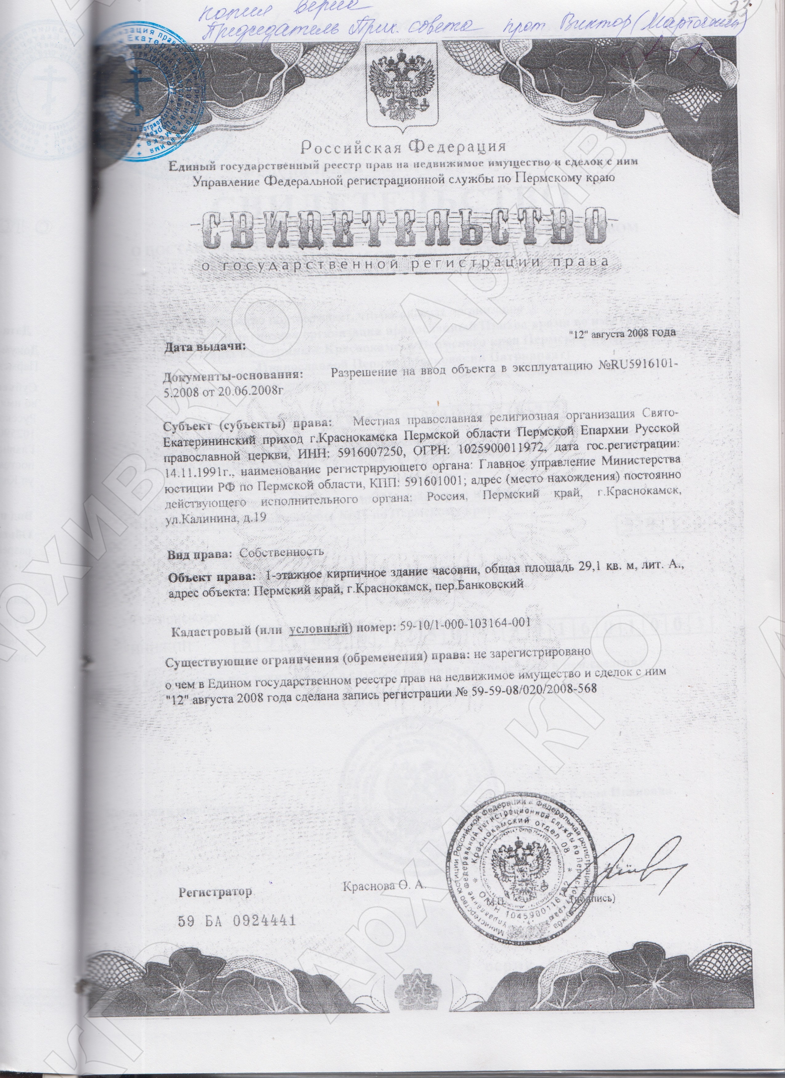 Реквизиты документа: Свидетельство о государственной регистрации права от 12.08.2008 59 БА № 0924441 местной православной религиозной организации Свято-Екатерининский приход г. Краснокамска Пермской области Пермской Епархии Русской православной церкви на здание часовни по адресу: г. Краснокамск, пер. Банковский. // АКГО. Ф. 118. Оп. 1. Д. 2039. Л. 33.