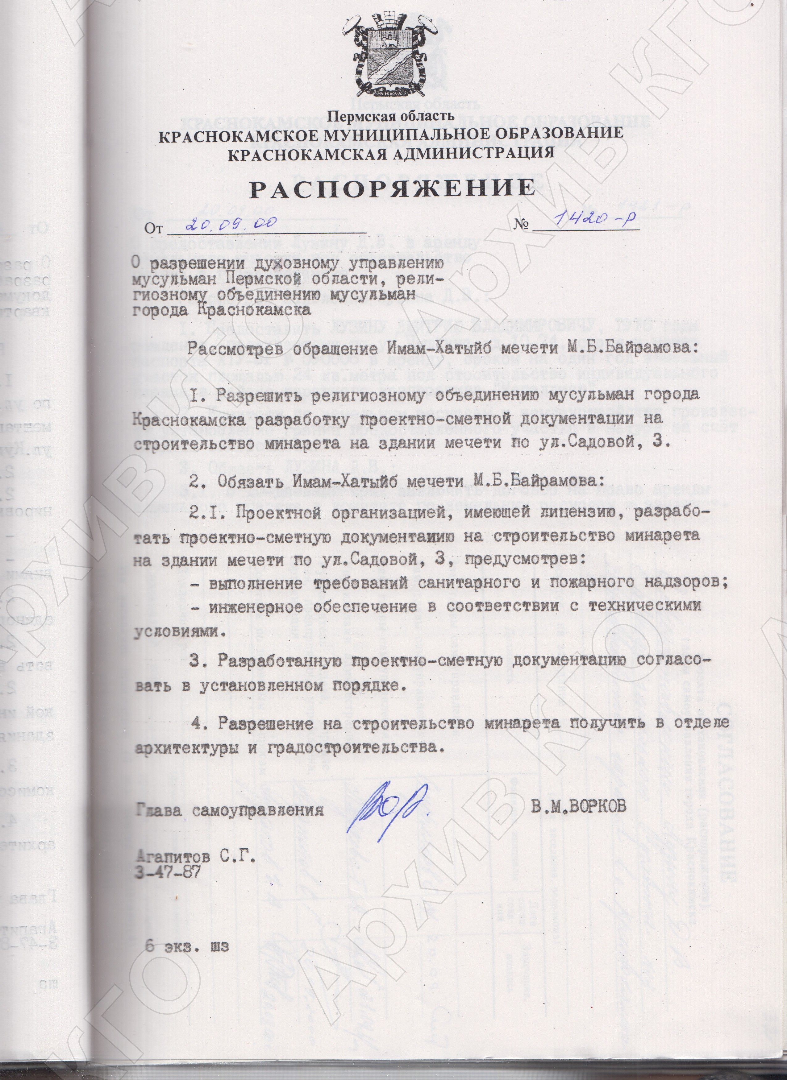 Реквизиты документа: Распоряжение Краснокамской администрации от 20.09.2000 № 1420-р «О разрешении духовному управлению мусульман Пермской области, религиозному объединению мусульман города Краснокамска» // АКГО. Ф. 118. Оп. 1. Д. 461. Л. 31.