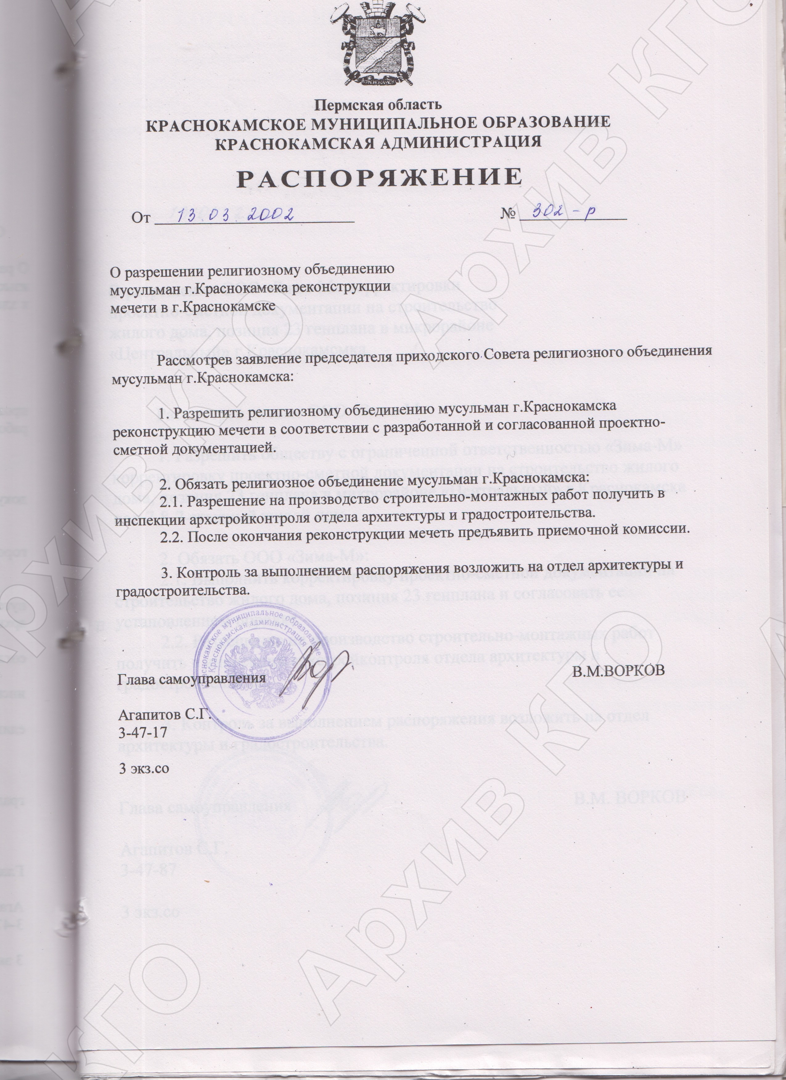 Реквизиты документа: Распоряжение Краснокамской администрации от 13.03.2002 № 302-р «О разрешении религиозному объединению мусульман г. Краснокамска реконструкции мечети в г. Краснокамске» // АКГО. Ф. 118. Оп. 1. Д. 582. Л. 129.