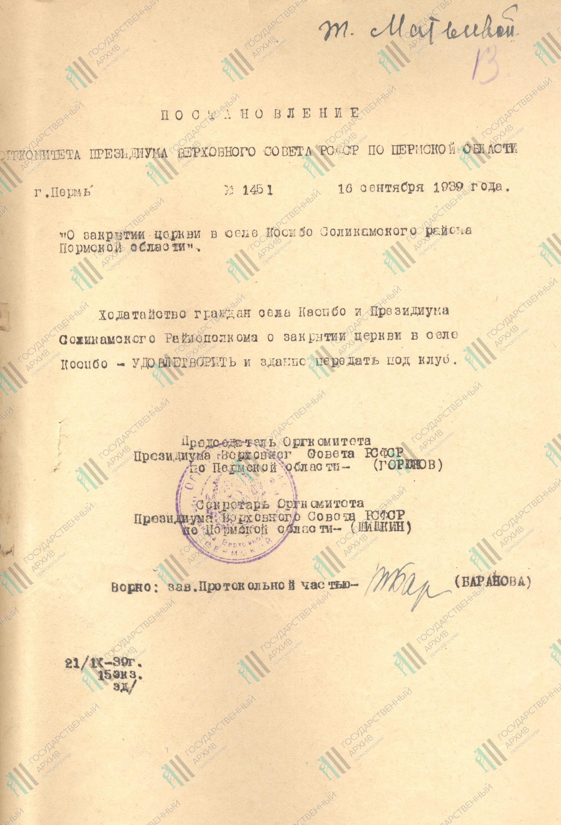 Реквизиты документа: Постановление оргкомитета Президиума Верховного Совета РСФСР по Пермской области №1451 от 16 сентября 1939 г. о закрытии церкви в с. Касиб Соликамского района Пермской области // ГАПК. Ф. р-1205. Оп. 1. Д. 527. Л. 13.