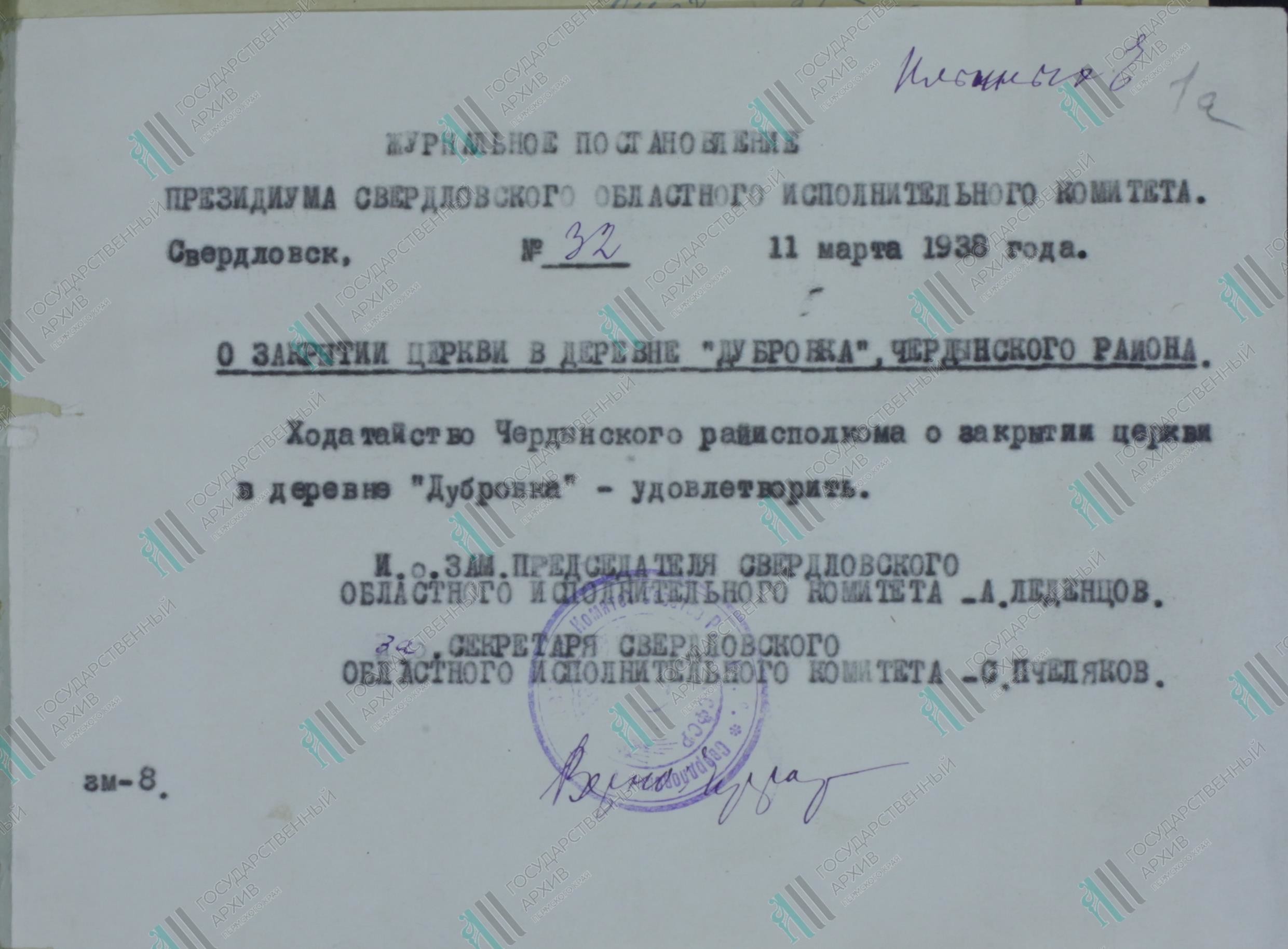 Перечень выявленных документов: Журнальное постановление Президиума Свердловского облисполкома №32 от 11 марта 1938 г. о закрытии церкви в с. Дубровка // ГАПК. Ф. р-1205. Оп. 1. Д. 594. Л. 1а.